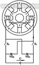 四相(8/6)結構SR電動機原理圖。為簡單計,圖中只畫出A相繞組及其供電電路。SR電動機的運行原理遵循“磁阻最小原理”— ‘磁通總要沿著磁阻最小的路徑閉合,而具有一定形狀的鐵心在移動到最小磁阻位置時,必使自己的主軸線與磁場的軸線重合。圖2中,當定子D-D’極勵磁時,1-1'向定子軸線D-D'重合的位置轉動,并使D相勵磁繞組的電感最大。若以圖中定、轉子所處的相對位置作為起始位置,則依次給D→A→B→C相繞組通電,轉子即會逆著勵磁順序以逆時針方向連續(xù)旋轉;反之,若依次給B→A→D→C相通電,則電動機即會沿順時針方向轉動??梢?,SR電動機的轉向與相繞組的電流方向無關,而僅取決于相繞組通電的順序。另外,從圖2可以看出,當主開關器件S1、S2導通時,A相繞組從直流電源US吸收電能,而當S1、S2關斷時,繞組電流經續(xù)流二極管VD1、VD2繼續(xù)流通,并回饋給電源US。因此,SR電動機傳動的共性特點是具有再生作用,系統效率高。